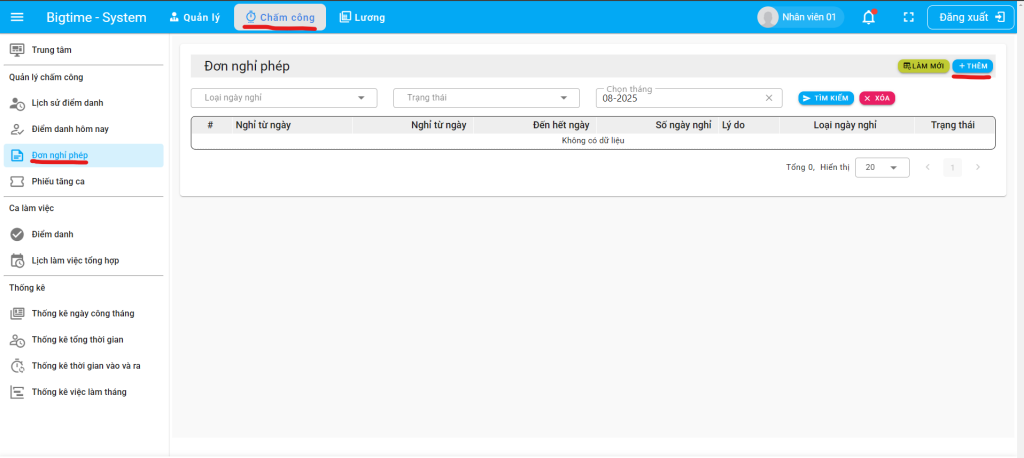 Bước 1: Đăng nhập và truy cập giao diện đơn nghỉ phép và nhấn nút thêm