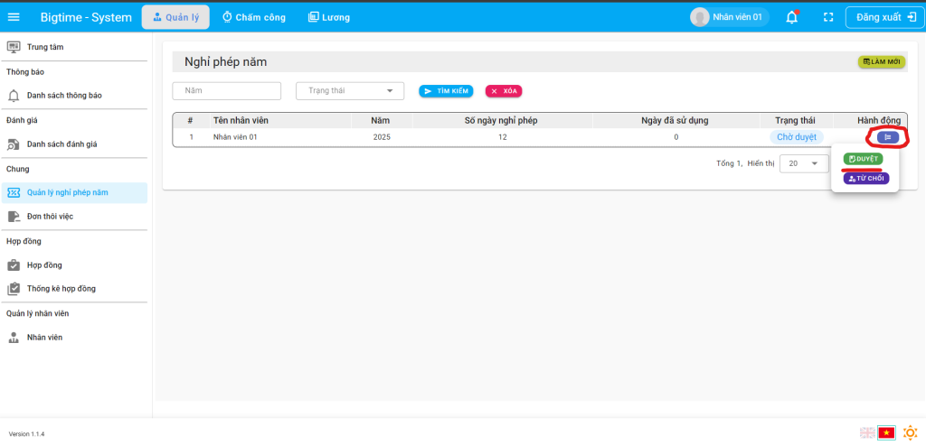 3.1 Truy cập vào hệ thống bằng tài khoản nhân viên và duyệt => Nhấn biểu tượng màu xanh và nhấn duyệt, sau khi duyệt xong nhân viên có thể tạo đơn xin nghỉ phép năm
