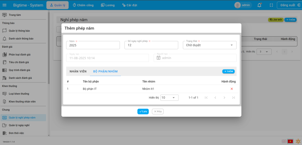 Bước 2: Thao tác thêm phiếu nghỉ phép năm cho nhân viên hoặc bộ phận