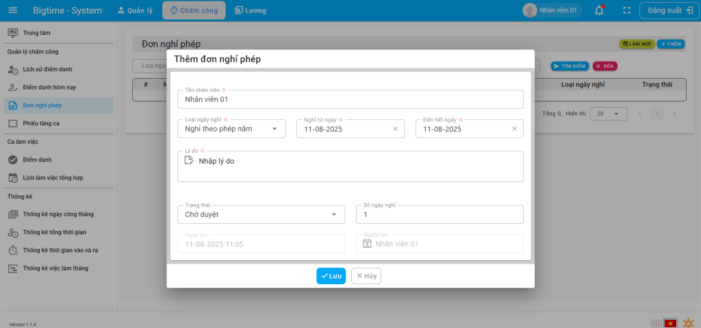 Bước 2: Chọn loại ngày nghỉ => Chọn nghỉ từ ngày – đến hết ngày => Nhập lý do và bấm lưu sau khi lưu đơn nghỉ phép sẽ được gửi lên cho quản lý duyệt
