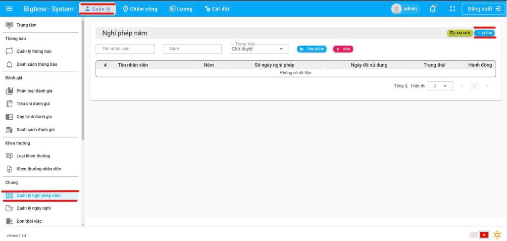 Bước 1: Quản lý truy cập giao diện “Quản lý nghỉ phép năm” Nhấn nút thêm