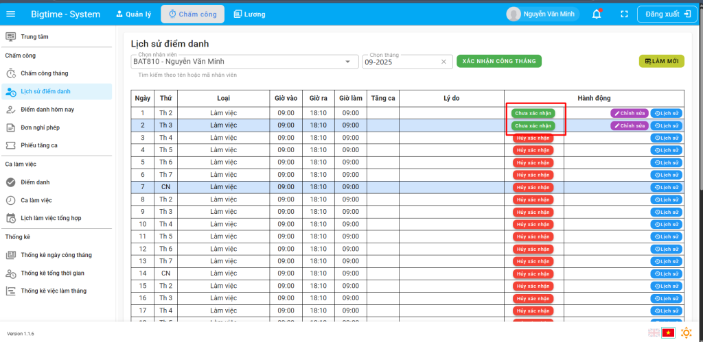 Nhân viên truy cập giao diện lịch sử điểm danh và bấm nút “Chưa xác nhận” để xác nhận ngày công.