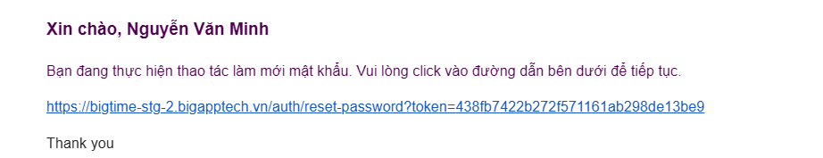 Trong nội dung email, nhấn vào đường link đặt lại mật khẩu được gửi từ hệ thống.