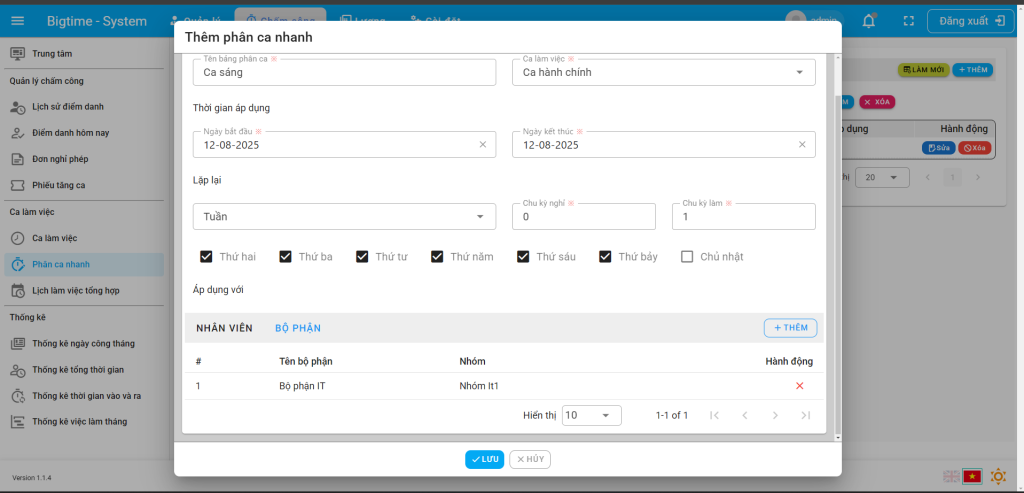Bước 2: Điền đầy đủ các thông tin như hình bên dưới và bấm lưu sẽ thêm phân ca thành công