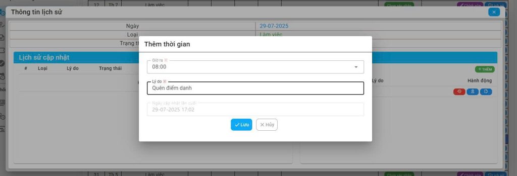 Lưu ý: Trường hợp quên điểm danh vào khi thêm giờ checkin trên giao diện hiện là giờ ra quy tắc là khi bạn sửa thời gian check in/out thời gian bé hơn sẽ là thời gian check in vào và thời gian lớn hơn sẽ là thời gian check out ra