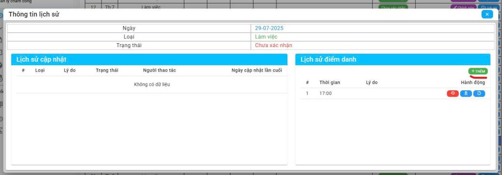 Bước 2: Sau khi nhấn vào nút lịch sử tiếp tục nhấn vào nút “Thêm” để thêm giờ khi quên điểm danh vào