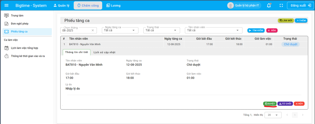 Bước 2: Tiến hành thao tác duyệt phiếu tăng ca, nhấn vào tên nhân viên và nhấn duyệt