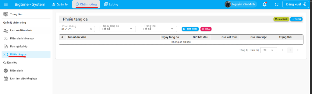 Bước 1: Nhân viên truy cập giao diện phiếu tăng ca và nhấn nút “Thêm”