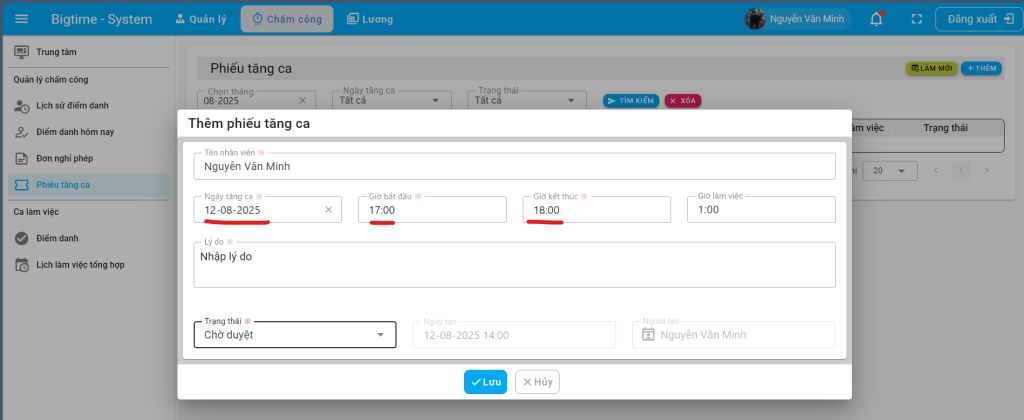 Bước 2: Điền các thông tin như “Ngày tăng ca”, “Giờ bắt đầu”, “Giờ kết thúc”, “Nhập lý do” sau đó nhấn “Lưu” với trạng thái là chờ duyệt. Sau khi lưu hệ thống sẽ tự động gửi phiếu tăng ca lên cho quản lý duyệt